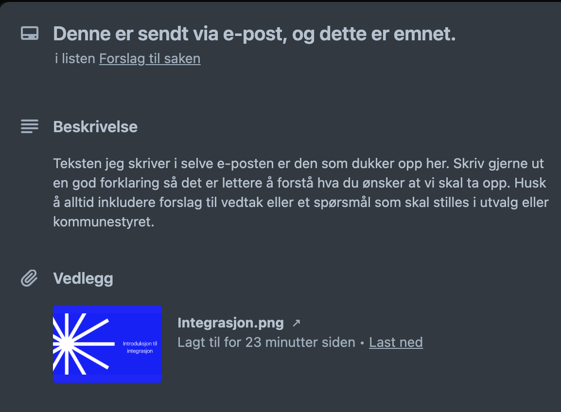 Sånn ser det ut når vi får inn innspillet ditt. Overskriften er emnet, brødteksten er det du skriver i mailen, og vedlegg lastes opp.